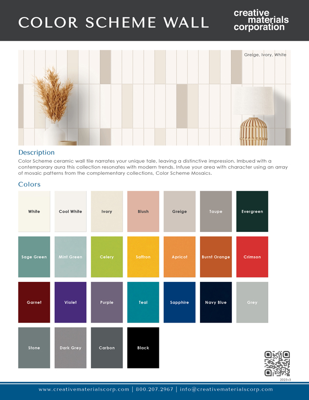 Color Scheme Wall is a ceramic tile that narrates your unique tale, leaving a distinctive impression. Imbued with a contemporary aura, this collection resonates with modern trends. You can use an array of mosaic patterns from the complementary collections of Color Scheme Glazed and Color Scheme Unglazed to create layered compositions that elevate visual interest while maintaining harmony within cohesive interior concepts.