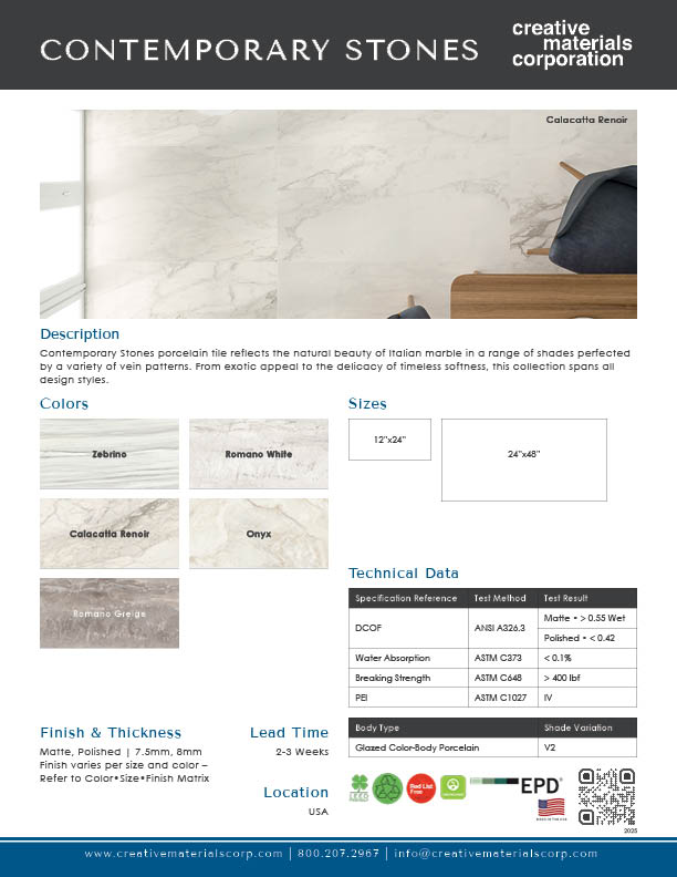Contemporary Stones porcelain tile reflects the natural beauty of Italian marble in a range of shades perfected by a variety of vein patterns. From exotic appeal to the delicacy of timeless softness, this collection spans all design styles.