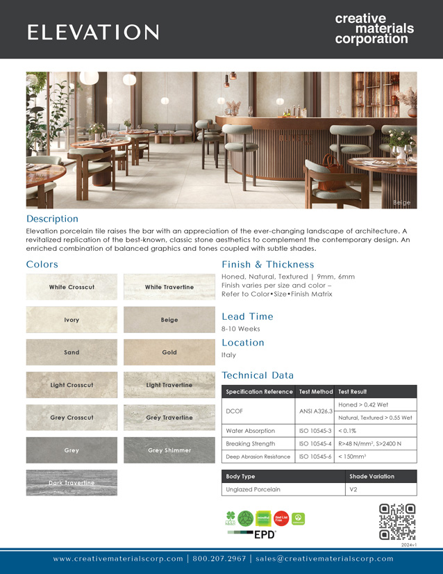 Elevation is ideal for commercial interiors and exteriors where long-term durability, slip resistance, and ease of maintenance are essential. Its technical properties make it suitable for high-traffic areas, including lobbies, corridors, retail environments, multifamily amenity spaces, and hospitality zones. Available in multiple sizes and finishes, this versatile porcelain series provides flexible layout options for wall and floor applications, including wet areas and outdoor installations.