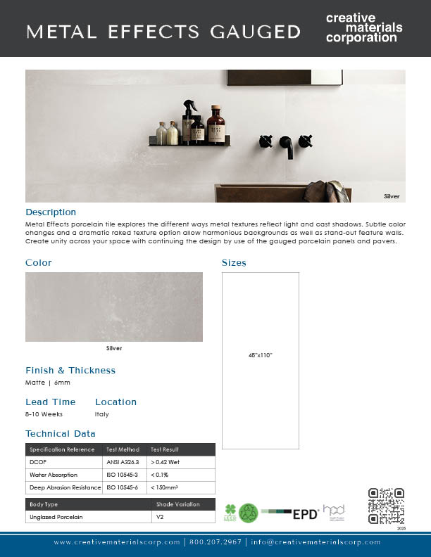 Metal Effects is considered “LEED-friendly” because it has an Environmental Product Declaration (EPD), Health Product Declaration® (HPD), and contains recycled content. Each of these components can contribute to credit points in accordance with the LEED V4.1 rating system.