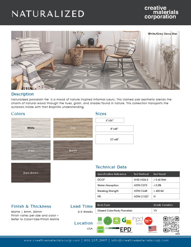Naturalized porcelain tile is a mood of nature inspired informal luxury. This stained oak aesthetic blends the charm of natural wood through the hues, grain, and shades found in nature.