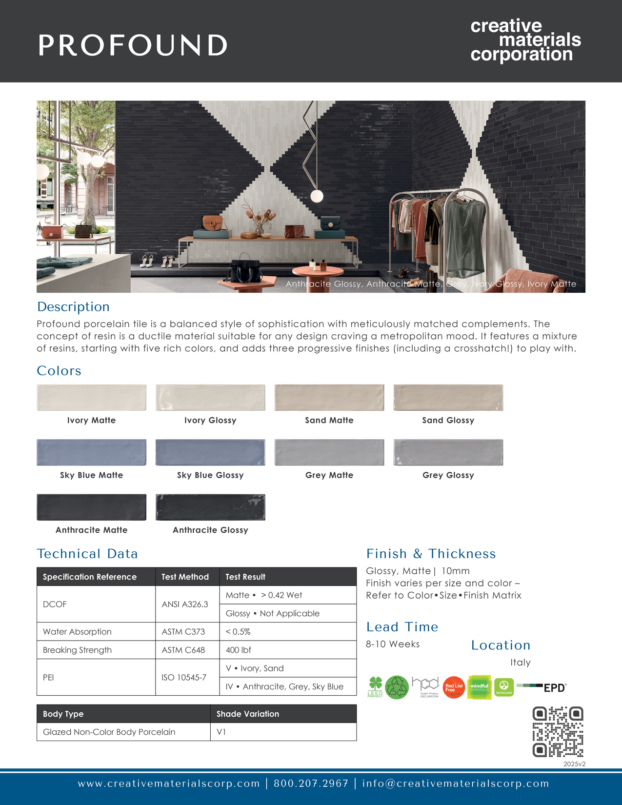 Profound porcelain tile blends artistic composition with practical sophistication, creating a cohesive foundation across floor, wall, and exterior applications. Drawing inspiration from the fluidity of resin, this collection introduces a tactile surface visual that feels both contemporary and timeless. Five saturated hues offer a rich palette for seamless coordination, whether you’re designing for corporate interiors, retail flagships, or hospitality environments that demand visual cohesion and durability.