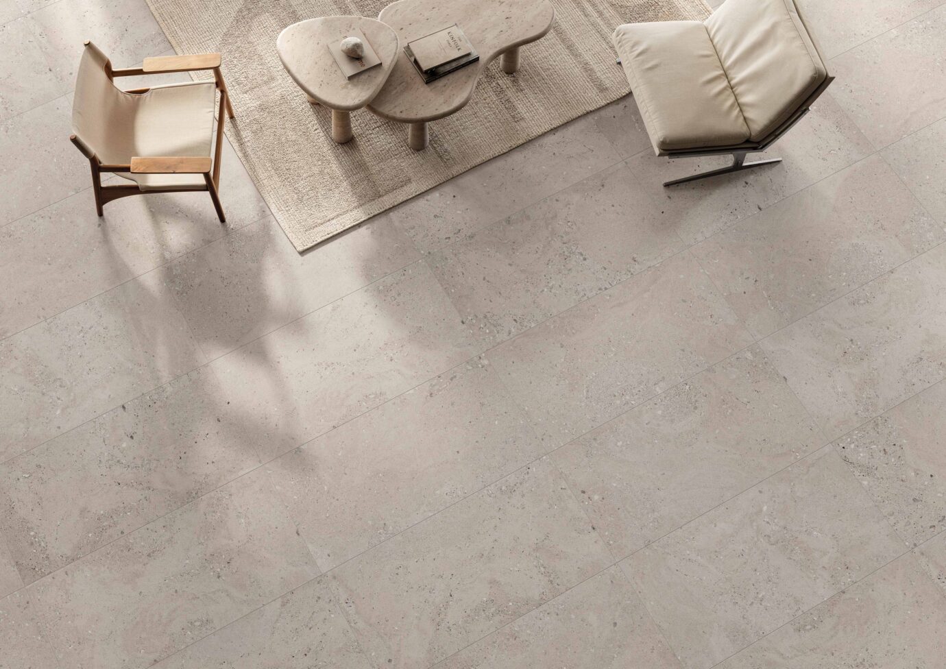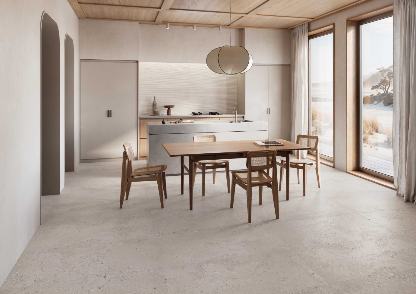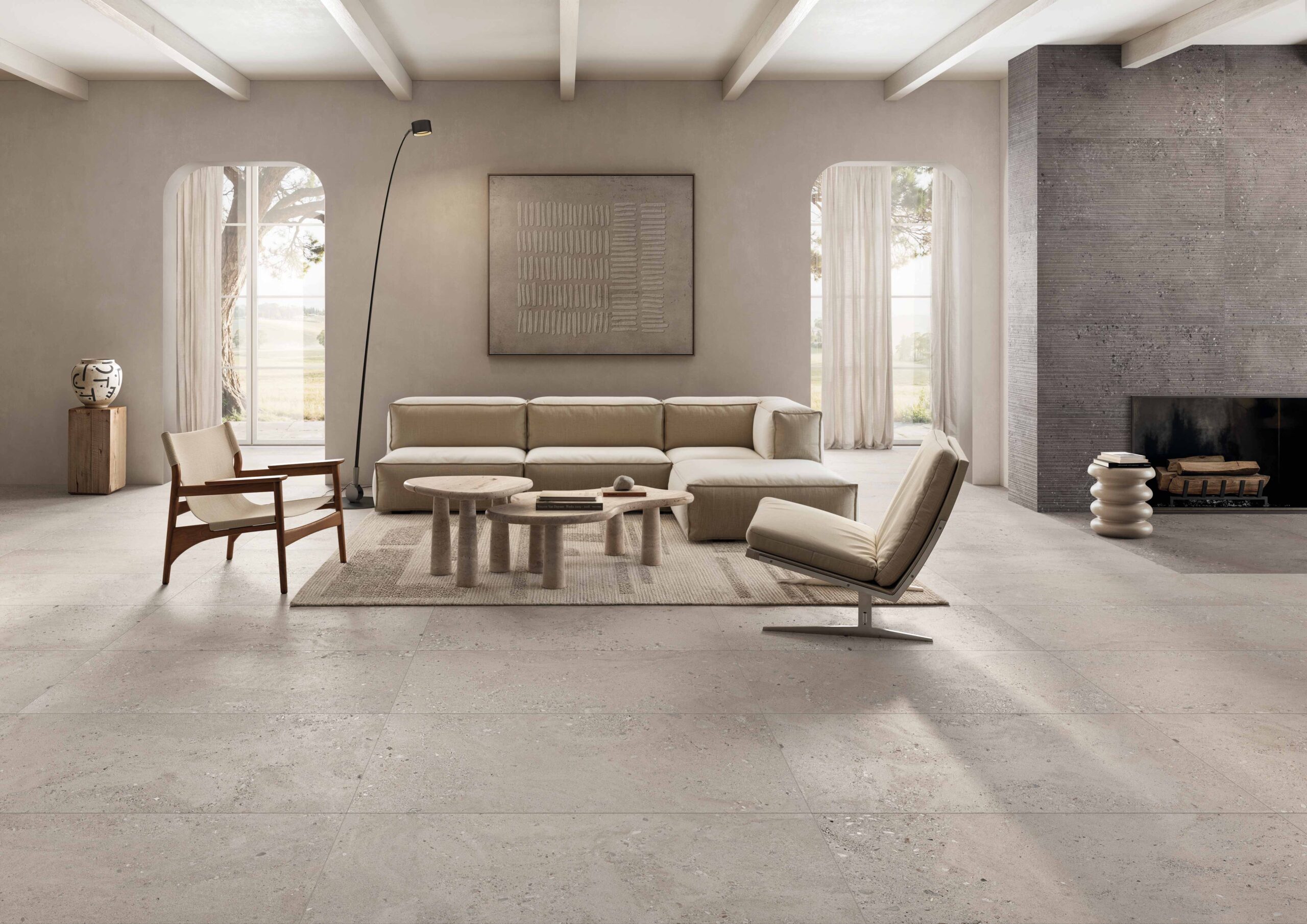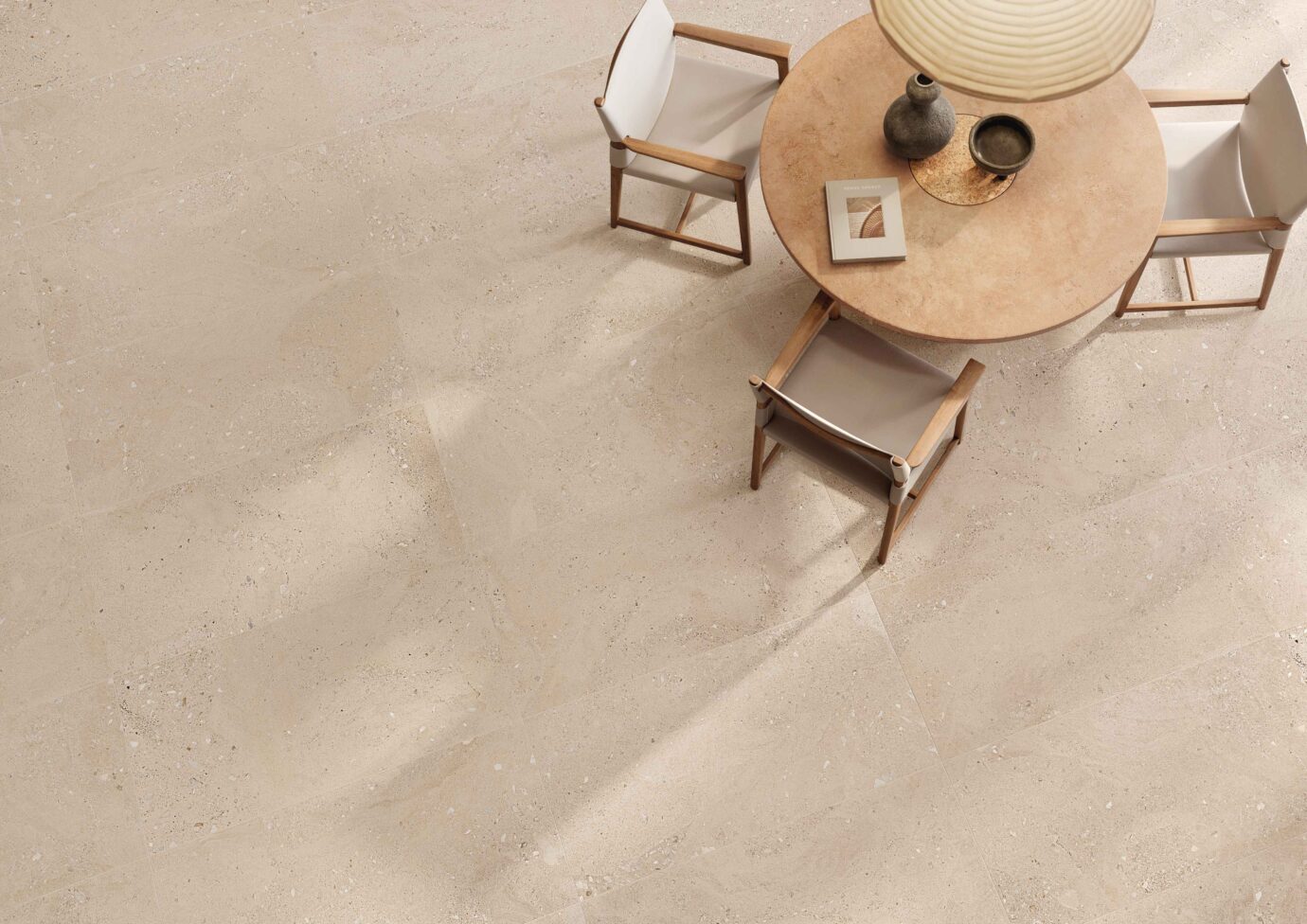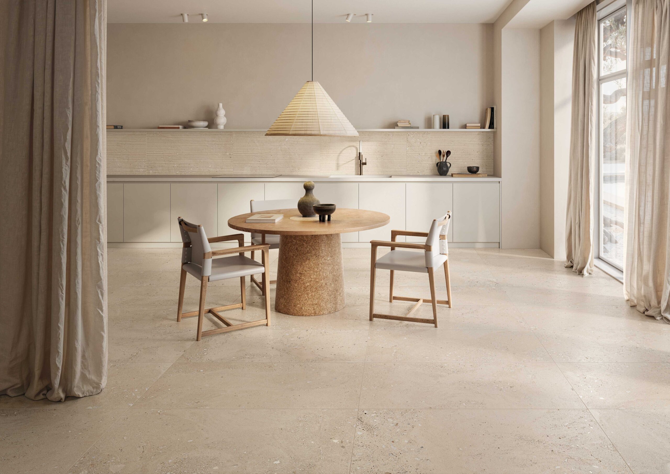Seascape porcelain tile captures the essence of the ocean floor, shaped by time and nature, resulting in a sophisticated stone-like appearance. Its surface features a soft texture, adorned with delicate mineral specks and hints of shell-like patterns, offering a refined visual and tactile experience. With a palette of warm, neutral tones, Seascape provides a serene yet elevated aesthetic that complements both minimalist and layered design styles.
