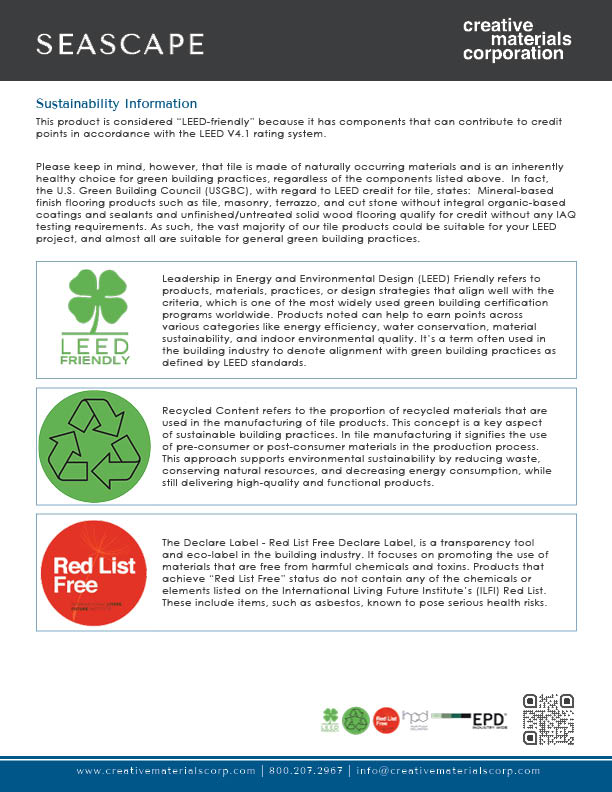 Seascape is considered “LEED-friendly” because it has an Environmental Product Declaration (EPD), a Health Product Declaration (HPD), and contains recycled content. Each of these components can contribute to credit points in accordance with the LEED V4.1 rating system. Additionally, Seascape is part of the Declare-Lable Red List-Free platform.