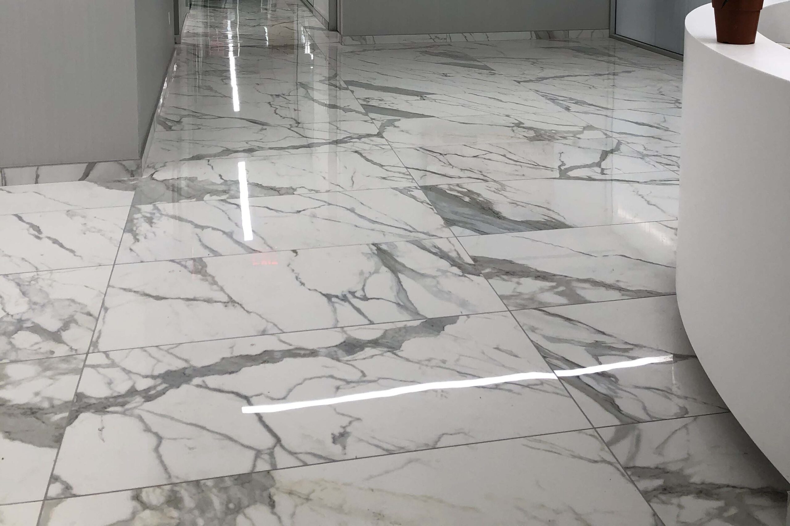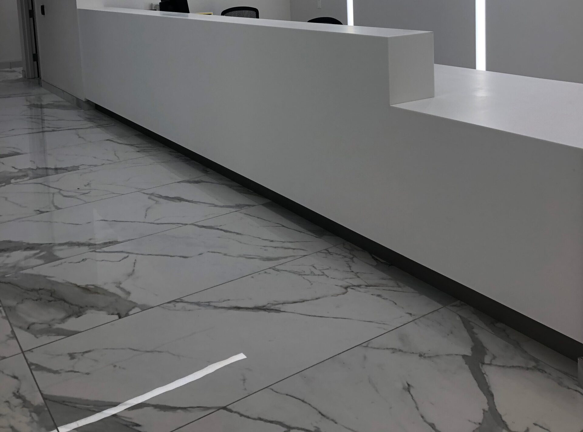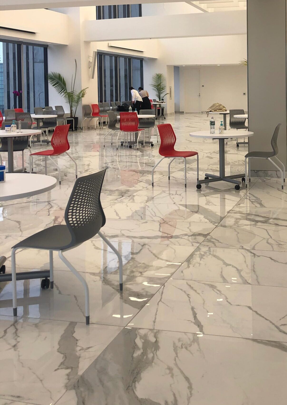 The flooring challenge for this project was the client’s expectation of a lighter color material and wish for a polished aesthetic. All parties worked through acceptance of safety liability and informing and agreeing to a need for more maintenance than perhaps is typically necessary with the light tone of the material.